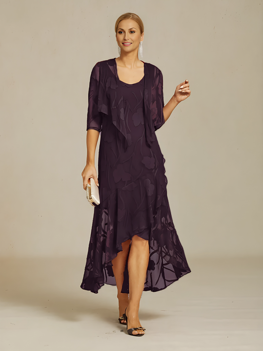 Floral Burnout Chiffon Evening Gown with Asymmetrical Hem