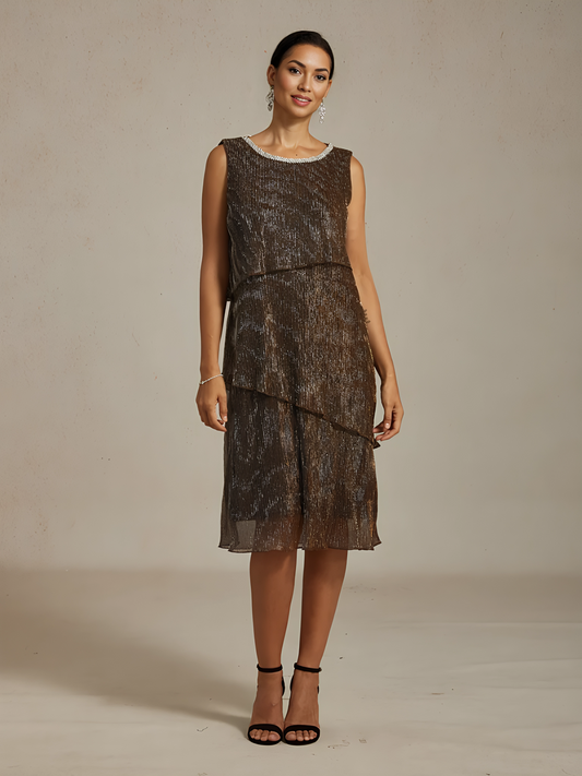 Metallic Pleated Chiffon Midi Dress with Beaded Neckline