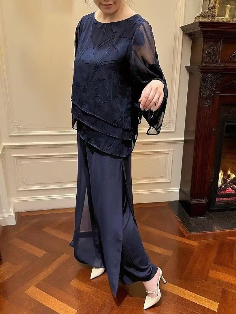 Step into effortless elegance with these cropped straight-leg pants featuring a flowing chiffon split-leg overlay. The mid-waist design and soft lining ensure comfort, while the sheer chiffon adds graceful movement, perfect for weddings, elegant dinners, and banquets.