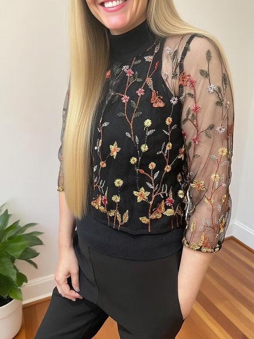Floral Embroidered Lace Jacket with Rhinestone Button